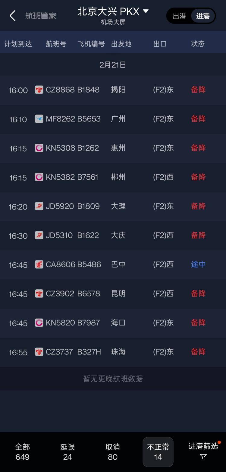19时许21日,询航班管家浮现纵目音讯记者查,国际机场为例以北京大兴,达27%耽搁率已,架次航班显示不服常进港航班中有14,青岛等邻近机场已备降天津、,间待定复飞时亚星代理航班显示已撤废另有80架次,班显示耽搁24架次航。