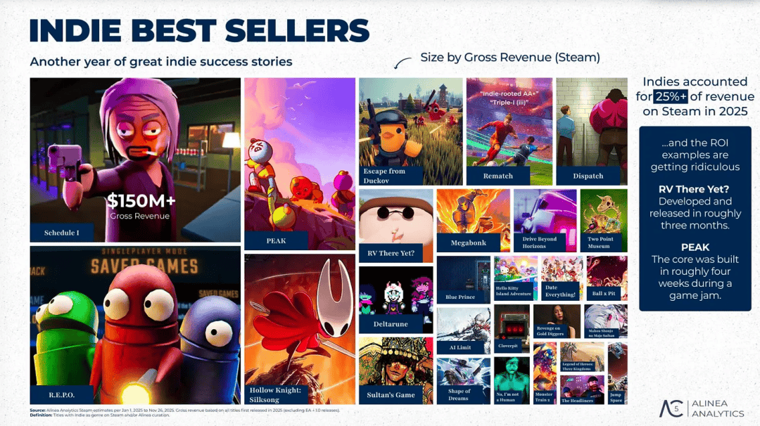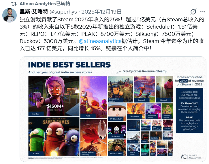 领域也冲破了史籍峰值这一年Steam营收,nalytics统计按照Alinea A,年11月中旬截至2025,计到达162亿美元Steam年营收累,177亿美元(约1231亿元)该数据正在12月19日又冲破至,凌驾15%同比增幅。提的是值得一,am总营收的25%独立游戏占Ste。