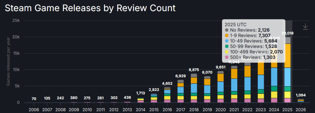评这一层次再看迥殊好,率90%以上的作品总共包罗31款好评,80%以上的游戏以及43款好评率。「万评」游戏的半壁山河这一档吞噬了136款,爆款作品的中坚气力和风向标毫无疑义是2025年高分。