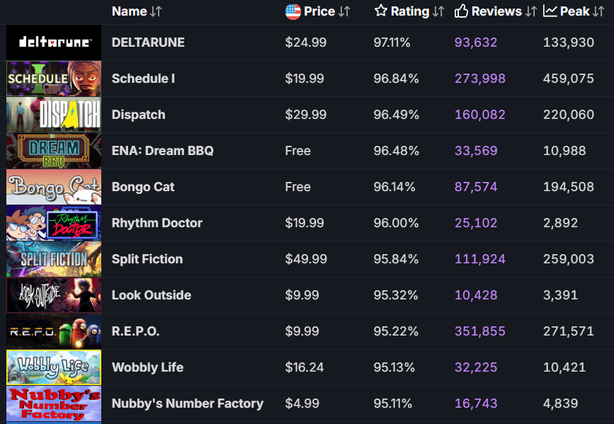 DELTARUNE(三角符文)》2025年好评率最高的作品是《,30万套销量为1,(约2亿零570万元)营收达2960万美金。