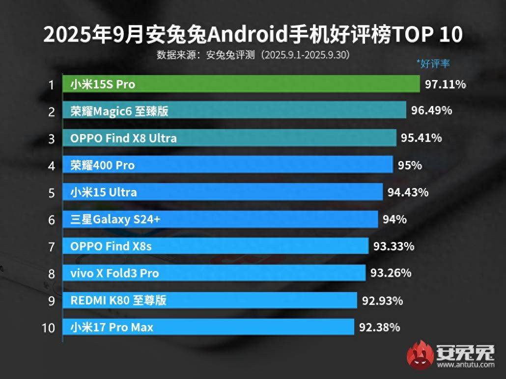 份安兔兔安卓好评榜今先天享的是9月,榜单比拟和8月份,有了光鲜的变更机型和排名都,该机型用户对待本人手机的打分数据开头是安兔兔评测APP内。表的是比拟意,ro Max仅排第十比来很火的幼米17P,1芯片的幼米15S Pro排名第一的是搭载国产玄戒O,好评榜的详明实质以下是9月份安卓。